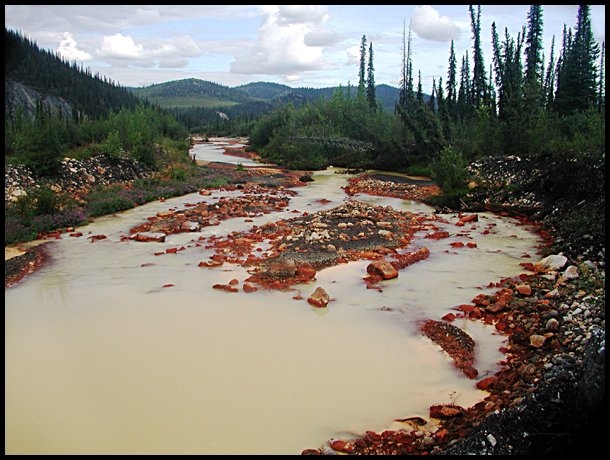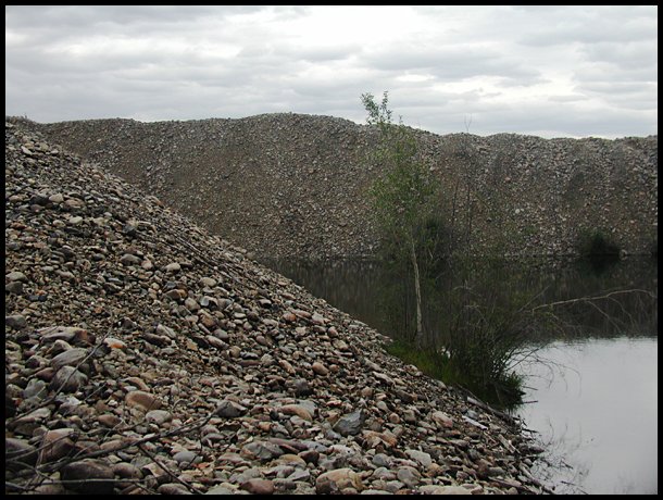 Dawson was first mined by placer operations. When the easy gold was gone, large corporations bought out the individual claims and brought in dredges. The dredges moved by digging ahead, allowing the water to fill the new channel, and dumping the gravel spoil sans gold behind. The spoil covers almost the entire valley floor in large heaps.. |