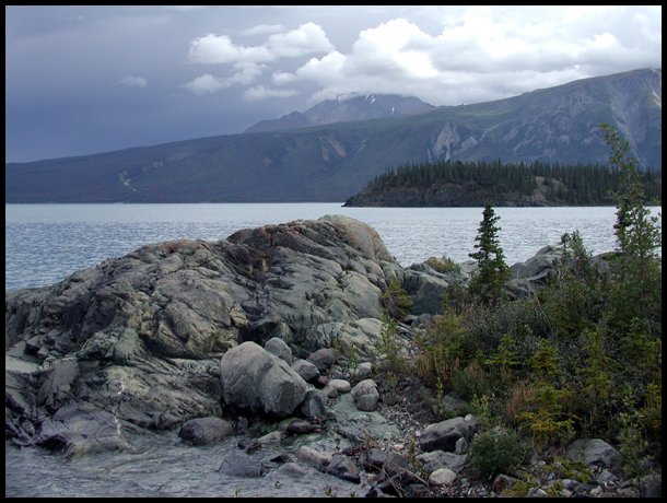 Southern Yukon, heading south along the Kluane River and Kluane Lake. There were storms behind and ahead in the mountains. As long as I stayed low, I stayed dry. The scenery around the lake was spectacular. There was an abandoned hotel on the lakeshore and it was hard to understand why the business had failed. | |||